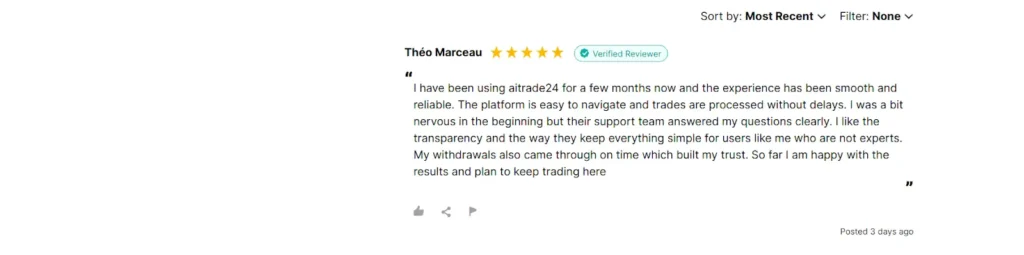 A user review on Reviews.io highlights a smooth and straightforward experience with AITrade24. The reviewer mentions timely withdrawals, clear support responses, and easy platform navigation. Despite early hesitancy, reliable service helped to build confidence over time. The remarks show that users, particularly those who are new to online trading, are satisfied with the platform’s openness and usefulness.